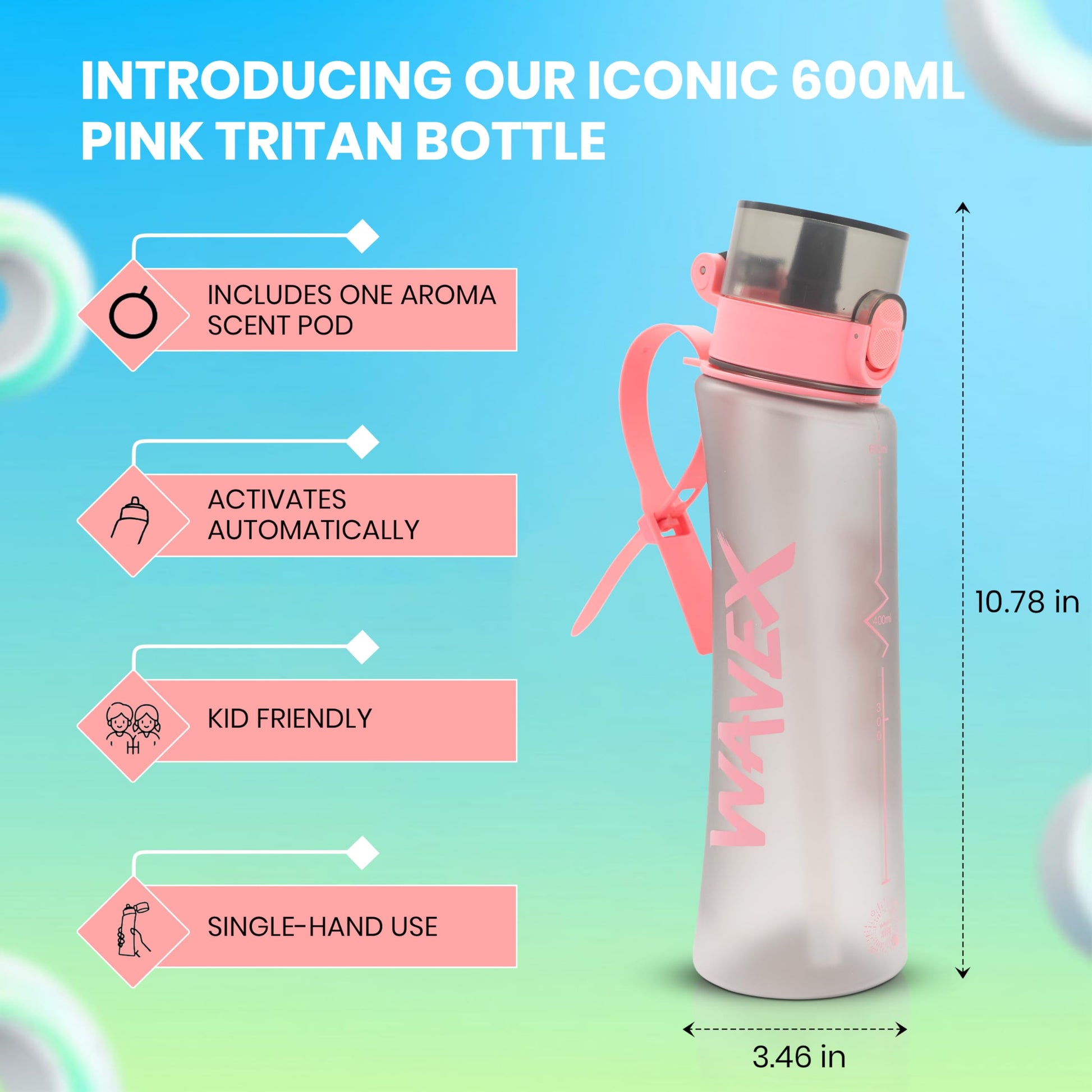 At WaveX, we’re determined to make plain water your favorite beverage of choice. We need to stay hydrated every day, so let’s make every sip enjoyable. Our durable travel bottles are designed to improve your hydration experience with the added benefits of flavor and fragrance. Our 600ml capacity high quality plastic water bottles are perfectly sized for everyday use.