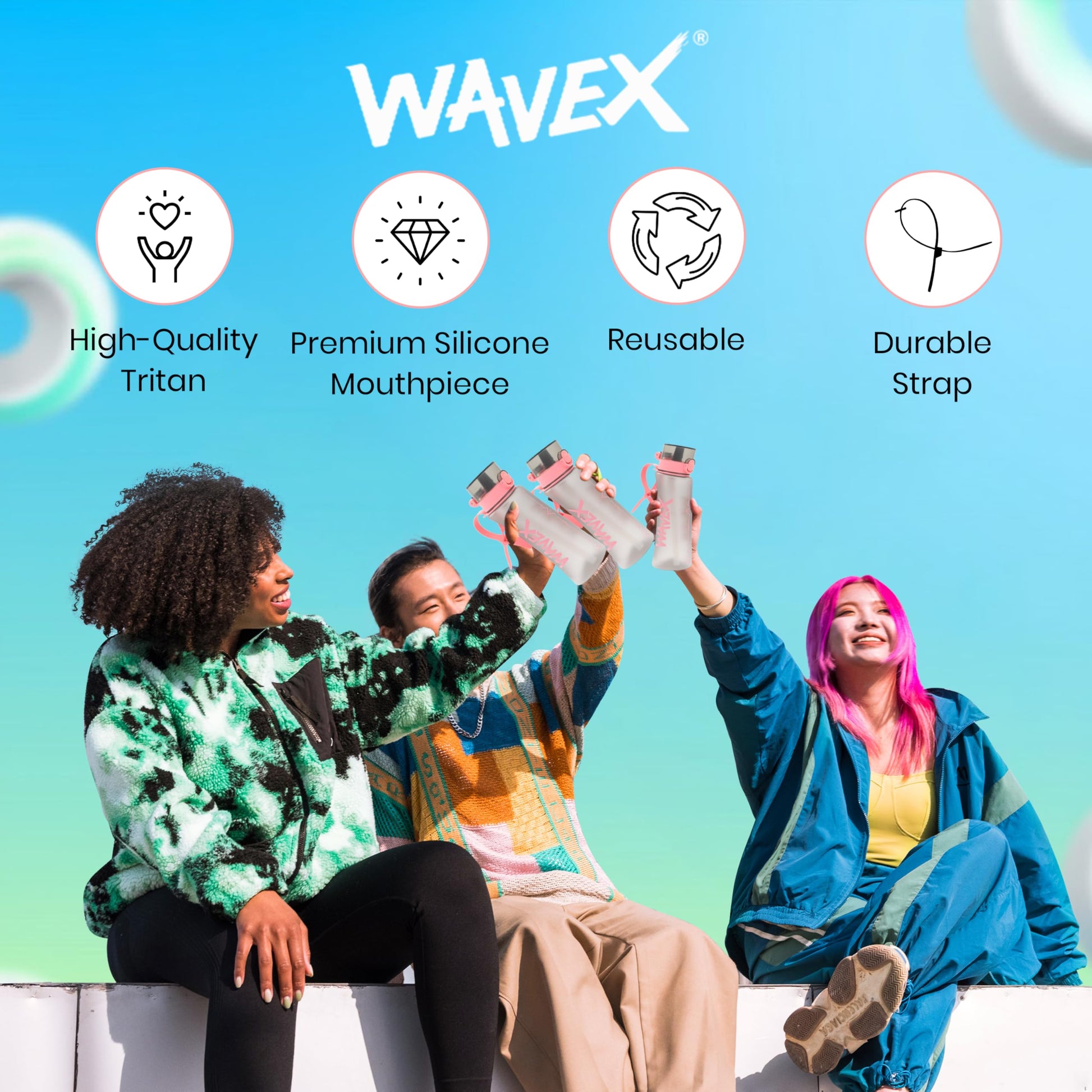 We’ve designed our water bottles to be easy-to-use, hygienic, and long-lasting. WaveX’s patented cap can be opened and closed with just one hand. The bottle features a secure locking lid and tight silicone seals to prevent leaks.